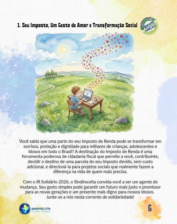 O Sindicato Nacional dos Analistas-Tributários da Receita Federal do Brasil (Sindireceita) anuncia o lançamento da cartilha "Imposto de Renda Solidário 2026: Seu Imposto Transforma Vidas!". A iniciativa visa esclarecer o processo de destinação de parte do Imposto de Renda (IRPF) devido para fundos sociais, transformando a declaração anual em um poderoso instrumento de solidariedade e impacto social.