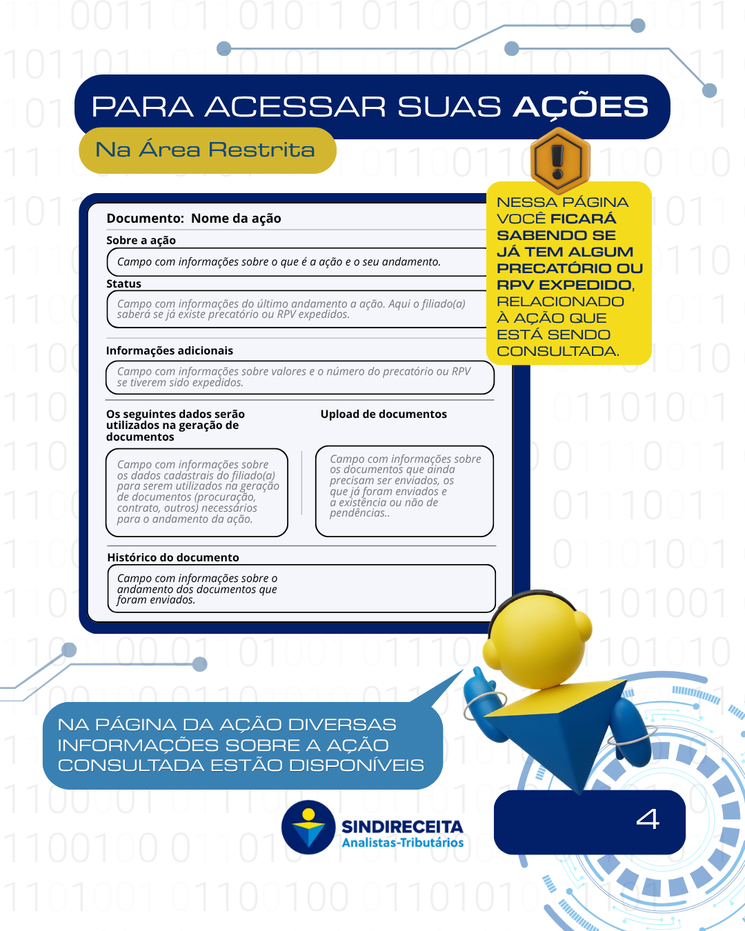Na cartilha, o filiado é orientado a acessar a Área Restrita no site do Sindireceita e, após o login, seguir até a opção Jurídico/Ações/Documentos. Nesse ambiente, é possível visualizar a lista de ações coletivas das quais participa e consultar informações sobre o andamento processual, documentos necessários, pendências, geração de documentos e histórico de envio. O conteúdo informa ainda que, quando houver, o filiado poderá verificar se já existe precatório ou RPV expedido, bem como dados complementares relacionados ao processo consultado.
