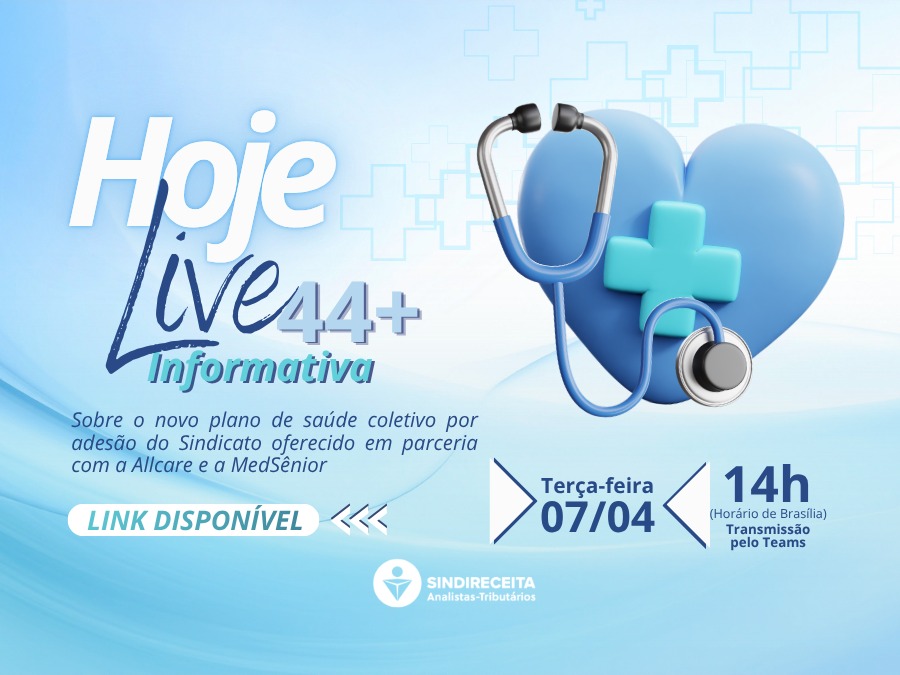 A Diretoria Executiva Nacional (DEN) convida os filiados e filiadas a participarem nesta terça-feira, dia 7, às 14h (horário de Brasília/DF), de Live informativa sobre o novo plano de saúde lançado pelo Sindicato por meio do Clube de Benefícios do Sindireceita e em parceria com a Allcare e a MedSênior. A nova opção foi desenvolvida para atender filiados e filiadas com 44 anos ou mais no Distrito Federal, Espírito Santo, Minas Gerais, Paraná, Rio de Janeiro, Rio Grande do Sul e São Paulo.