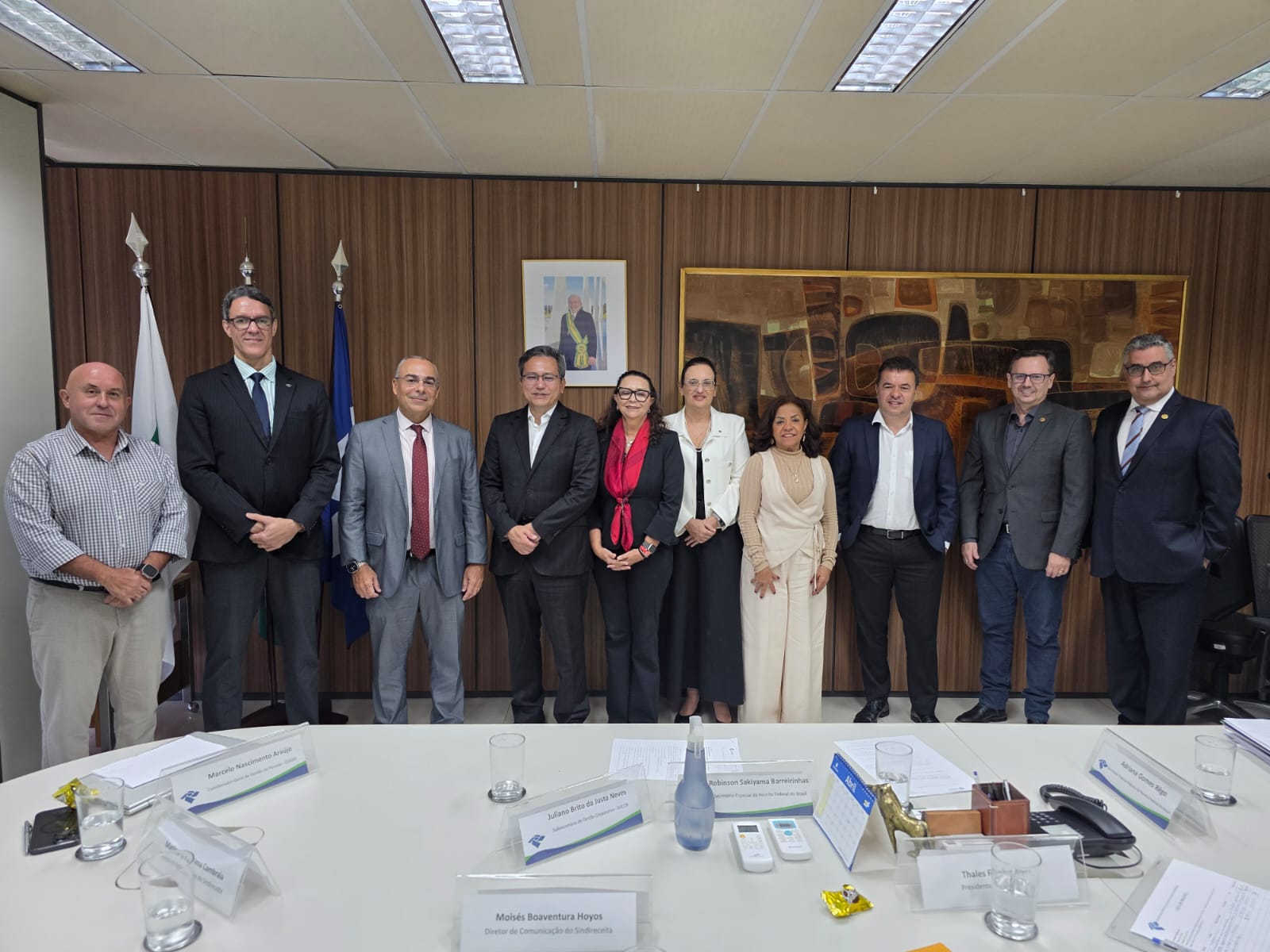 Nessa quinta-feira, dia 9, o Sindireceita participou de uma reunião com o secretário especial da Receita Federal do Brasil (RFB), Robinson Barreirinhas. Representaram a entidade o presidente da Diretoria Executiva Nacional (DEN), Thales Freitas; a vice-presidenta, Sílvia Felismino; e os diretores Fabiano Rebelo (Estudos Técnicos), Marlene Cambraia (Aposentados e Pensionistas), Gerônimo Sartori (Assuntos Aduaneiros) e Moisés Hoyos (Comunicação). Além do secretário especial, também participaram da reunião, pela RFB, a secretária especial adjunta, Adriana Gomes Rêgo; o subsecretário de Gestão Corporativa, Juliano Brito da Justa Neves; o coordenador-geral de Gestão de Pessoas, Marcelo Nascimento Araújo; e o subsecretário de Administração Aduaneira, Fabiano Coelho.