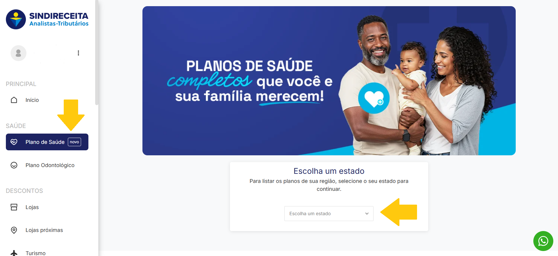 Para acessar o novo plano de saúde, basta fazer login (com seu usuário e senha) no site do Clube de Benefícios do Sindireceita (clique aqui). No site do Clube, localize a opção “Saúde”, no menu lateral esquerdo. Em seguida, basta clicar na opção “Plano de Saúde” e, depois, para listar os planos de sua região selecione seu estado no menu “Escolha um estado”. Veja o caminho resumido: Clube de Benefícios >> Entrar >> Saúde >> Plano de Saúde >> Escolha um estado.