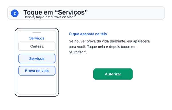Depois de entrar, procure a área de Serviços. Nela, toque em Prova de vida. Se houver uma prova de vida pendente, ela aparecerá na tela. Em seguida, toque em Autorizar para iniciar o processo.