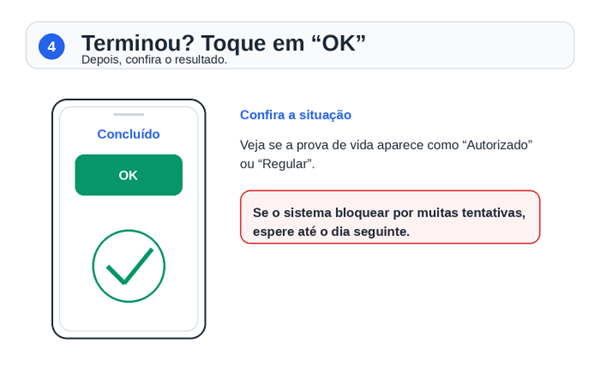 Quando o procedimento terminar, toque em OK. Depois disso, confira se a situação aparece como Autorizado ou Regular. O acompanhamento também pode ser feito no canal informado pelo órgão pagador.