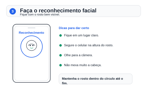 Na hora do reconhecimento facial, tente ficar com calma. Vá para um lugar claro, sem sombra no rosto. Segure o celular na altura do rosto, olhe para a câmera e não mexa muito a cabeça. O mais importante é manter o rosto dentro do círculo até o final. Essas são as orientações oficiais para aumentar a chance de o reconhecimento dar certo.