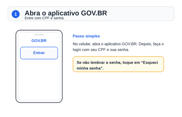 O primeiro passo é abrir o aplicativo GOV.BR no celular e entrar com CPF e senha. Se a senha tiver sido esquecida, o próprio aplicativo oferece a opção para recuperação