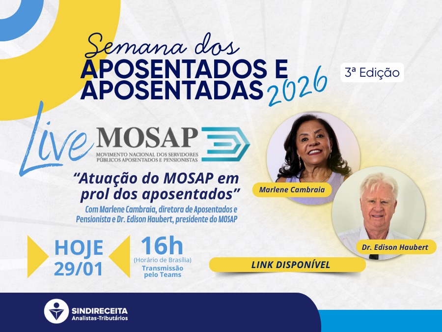 A Live terá participação da diretora de Aposentados e Pensionistas, Marlene Cambraia, e do presidente do MOSAP, Dr. Edison Haubert.