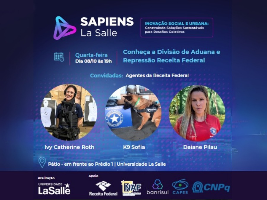 O tema da palestra será "Divisão de Aduana e Repressão da Receita Federal". O momento contará ainda com a participação especial da agente canina, K9 Sofia.